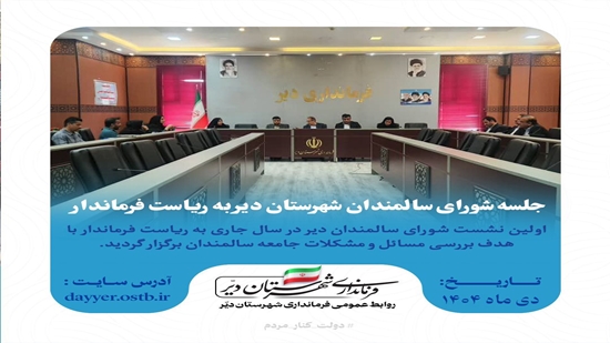 اولین نشست شورای سالمندان دیّر در سال جاری به ریاست فرماندار با هدف بررسی مسائل و مشکلات جامعه سالمندان برگزار گردید.