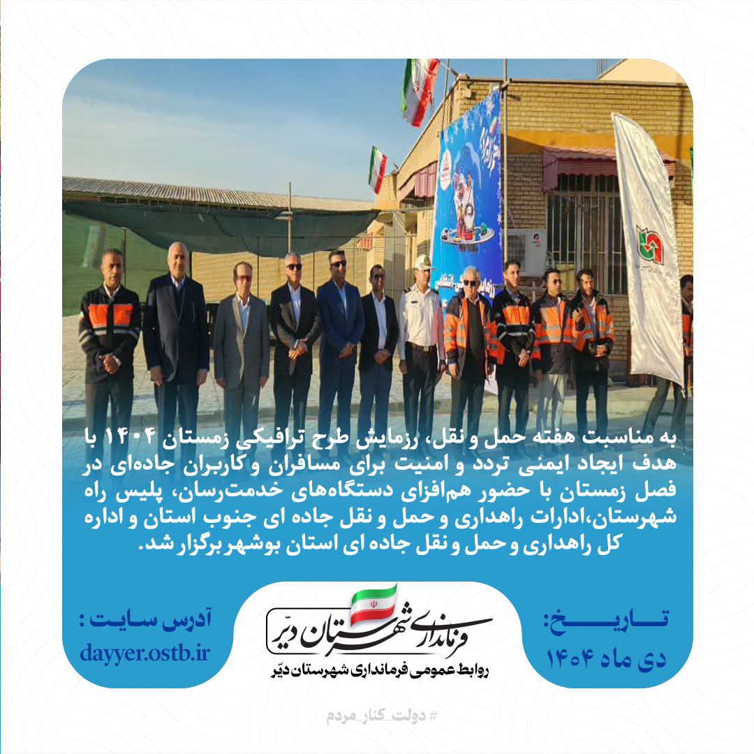 به گزارش روابط عمومی فرمانداری دیّر به مناسبت هفته حمل و نقل، رزمایش طرح ترافیکی زمستان ۱۴۰۴ با هدف ایجاد ایمنی تردد و امنیت برای مسافران و کاربران جاده‌ای در فصل زمستان با حضور هم‌افزای دستگاه‌های خدمت‌رسان، پلیس راه شهرستان،ادارات راهداری و حمل و نقل جاده ای جنوب استان و اداره کل راهداری و حمل و نقل جاده ای استان بوشهر برگزار شد.در این رزمایش که با حضور معاون هماهنگی امور عمرانی استاندار، فرمانداران دیّر و کنگان و مدیر کل راهداری و حمل و نقل جاده ای استان برگزار شد، بر لزوم همکاری همه دستگاه‌های خدمت‌رسان در میدان خدمت، توجه ویژه به کاهش تصادفات جاده‌ای، تلاش حمل‌ونقل اکثری در مسیر هوشمندسازی تأکید شد تا با آغاز فصل زمستان، تردد ایمن و روان در محورهای مواصلاتی تضمین شود.